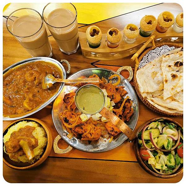 我今天點了印度香料飯.烤餅.洋蔥蝦.乳酸烤雞(無骨).芒果酸子酥球,甜點點了印度龍鬚糖.香料米布丁.飲料點了兩杯印度香料奶茶.木盆沙拉是店家送的!