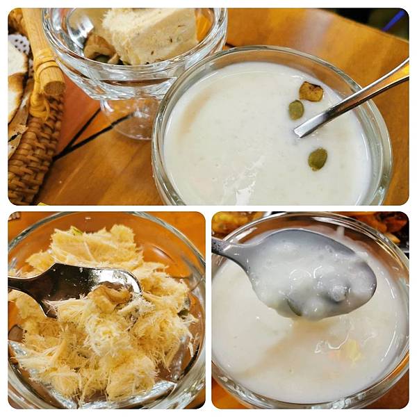 甜點是印度龍鬚糖跟香料米布丁~香料米布丁我比較意外一點!因為不是布丁嗎??但是他口感像西米露XDXD但是裡面是米跟奶還有堅果!不甜很特別的布丁!感覺走養生路線的印度甜點!