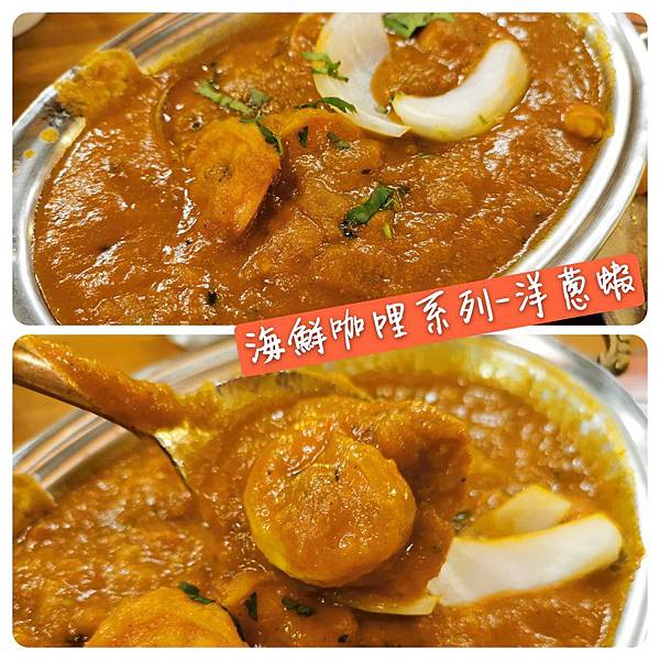 海鮮咖哩我點了洋蔥蝦!裡面蝦子超多的啦!而且很新鮮吃起來不會粉粉的!蝦肉很Q彈!沾滿咖哩醬汁跟洋蔥鮮甜!是我超愛的口味!剛吃不會覺得辣!我只能說他的辣是有後勁的那種!