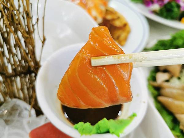 我最愛鮭魚了!超青的啦!厚度夠吃起來軟滑順口!漁港邊的生魚片就是不一樣!
