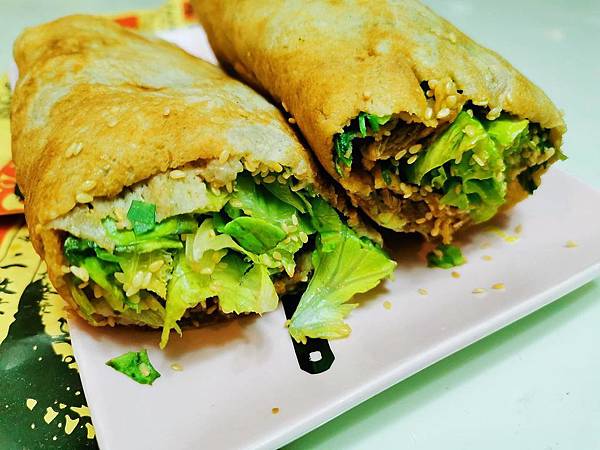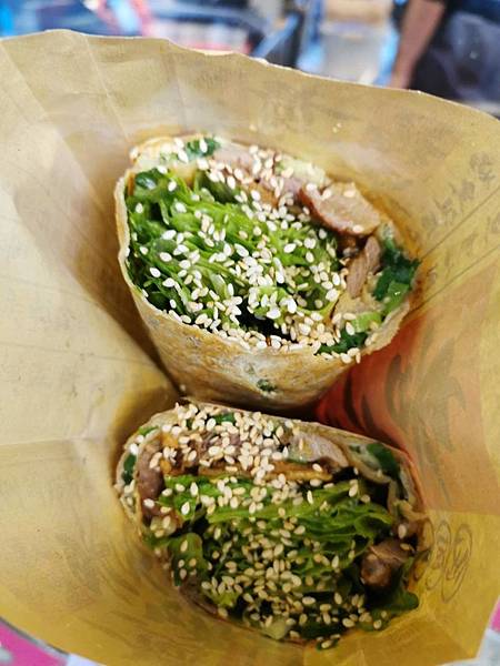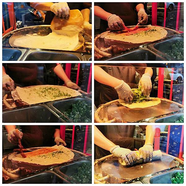 先是將穀粉麵糊放在烤盤上弄成薄又不易破裂的厚度!將外層烤得稍微脆脆然後大把大把的放上蔥.香菜......等配料(如果有什麼不吃的配料!記得是先跟老闆說啊!)要不然老闆都馬下重手沒在怕虧本的狂撒,接著呢將一邊餅皮折起來塗醬依序放上你點的肉.薄脆還有滿滿的蔬菜,最後用餅皮將所有料包好捲起來!然後切兩半撒上白芝麻提香,放入紙袋裡就大功告成惹!