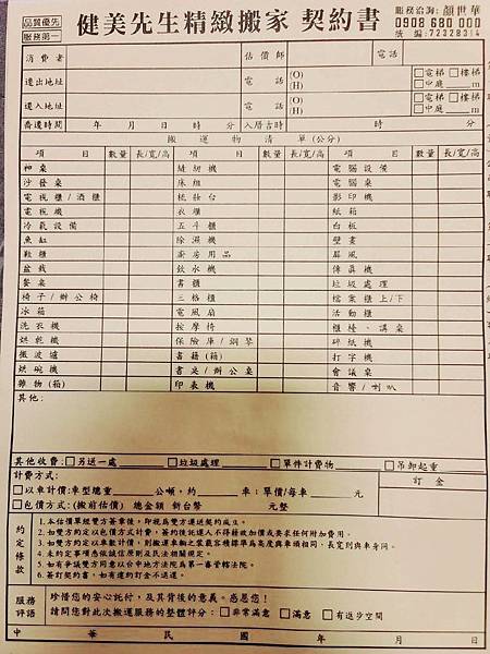 而且是免費到府估價服務唷!我覺得超貼心啊!有合約就更放心了!簽約這是對雙方都比較有保障的方式!台中搬家費用計算這家算非常合理的了!建議大家找搬家公司最好是找這種有簽約跟見面清點物品報價透明的搬家公司!