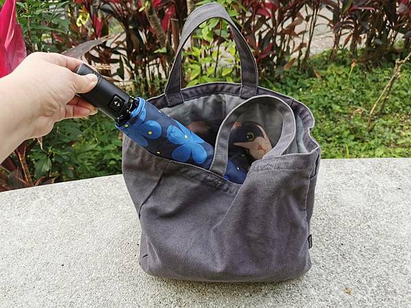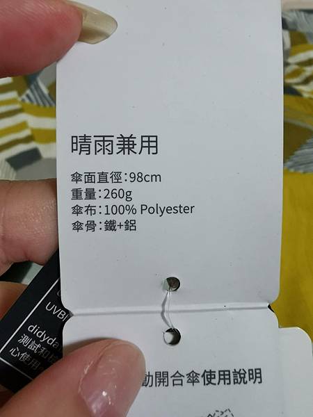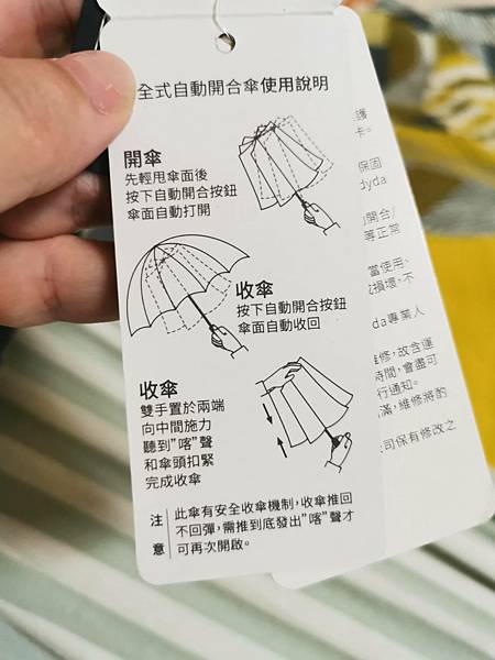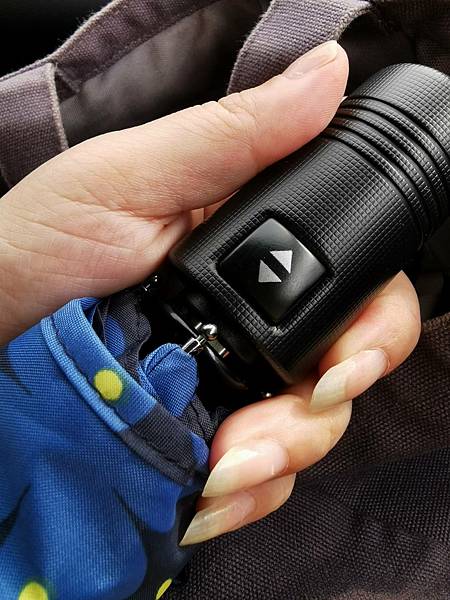 自動傘收傘時,裡面抓取往下拉如果覺得不好施力,可以像吊牌上的使用說明,用兩手在外往中間壓會更為理想唷!